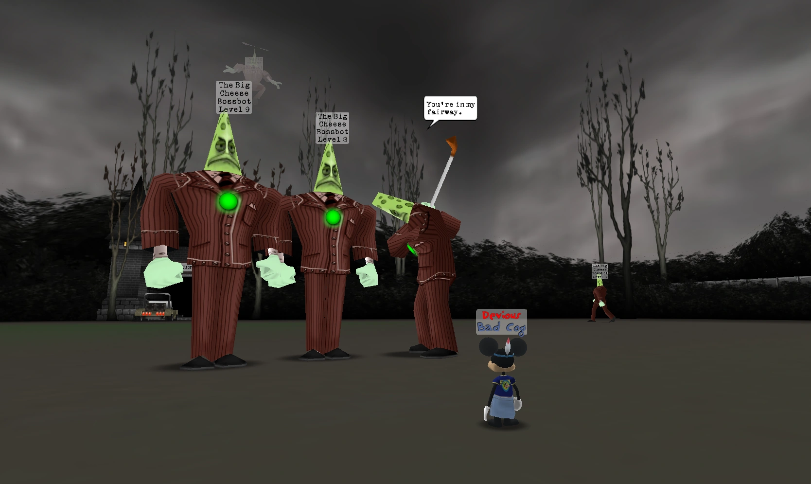 Even though we’re being worked till our parts rust, progress is being made. A vast majority of our businesses and field offices are taking over the streets. If we could experience humor, we would laugh at the amount of resistance you toons have put up. So while YOU play around with your seltzer and slapsticks, us cogs have been taking over Toontown. The Chairman even told us the first branch to conquer your playground will get to decide the name of the new and improved Cog HQ!
