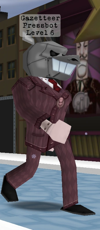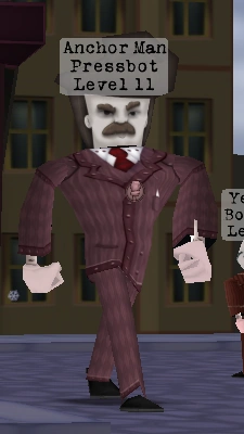 Pressbots are one of the five Cog Departments present in Tooniversal Studios, and are exclusive to Tooniversal as well. Pressbots do not currently have a confirmed Headquarters, nor a department head.