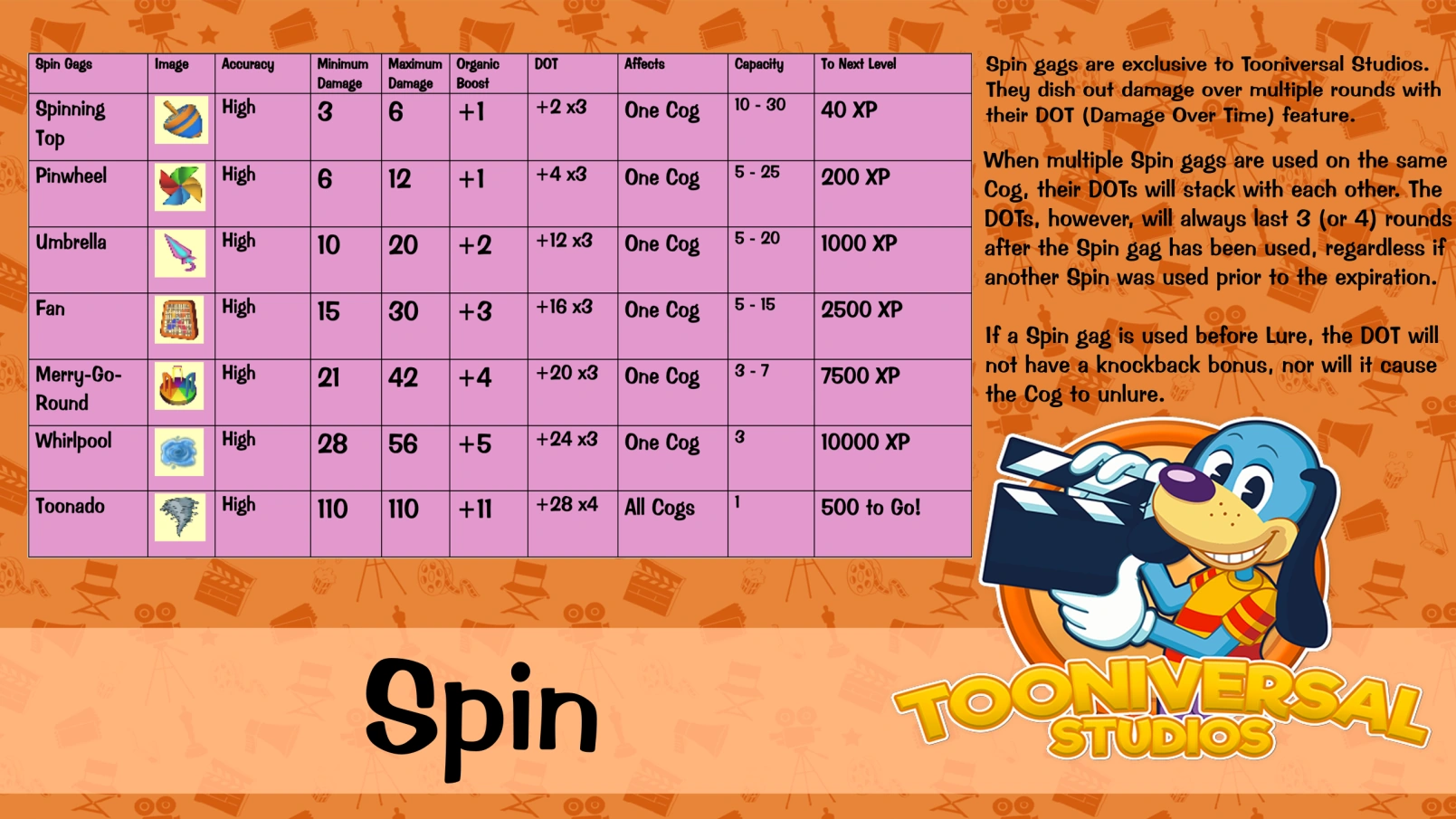 Spin is a Gag track that is exclusive to Tooniversal Studios and is the only Gag track in the game that did not originate from Toontown Online. Its main purpose is to provide damage over time to the Cogs for 3-4 rounds. It is the only Gag track that exhibits this property. Spin is the eighth Gag to be used in a Cog battle, right after Drop. Its track color on the Gag menu is white and it is right underneath Drop. It has high accuracy. Gag experience for the Spin track is only gained on the initial use and does not account for the damage over time.